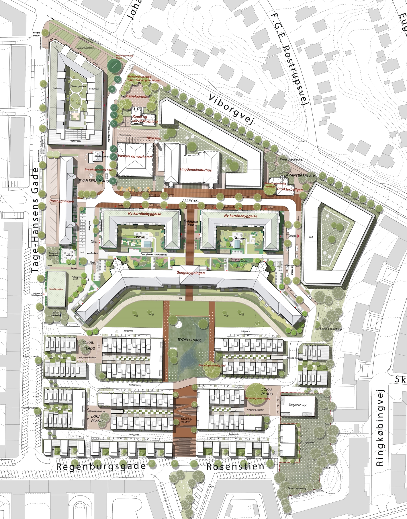 Amtssygehusets historie skal leve videre i et nyt kvarter i Aarhus Midtby. Det gamle hospitalsanlæg og miljø er nøje læst og karakteriseret, så bykvarteret kan bygge videre på kvaliteterne og udvikle området med respekt for den historiske stemning og fortællinger. Udviklingen bliver styret med en lang række krav, som sikrer, at området får en høj kvalitet. Den gamle allé gennem anlægget bliver genskabt, så det igen bliver en vigtig akse og hovedgade. De oprindelige hospitalsbygninger med klassiske røde tegl og gule bånd bliver bevaret og nænsomt omdannet til boliger, erhverv og kulturtilbud. Kvarterets nye bygninger fortolker sygehusets genkendelige arkitektur, så der er en tydelig rød tråd gennem kvarteret.